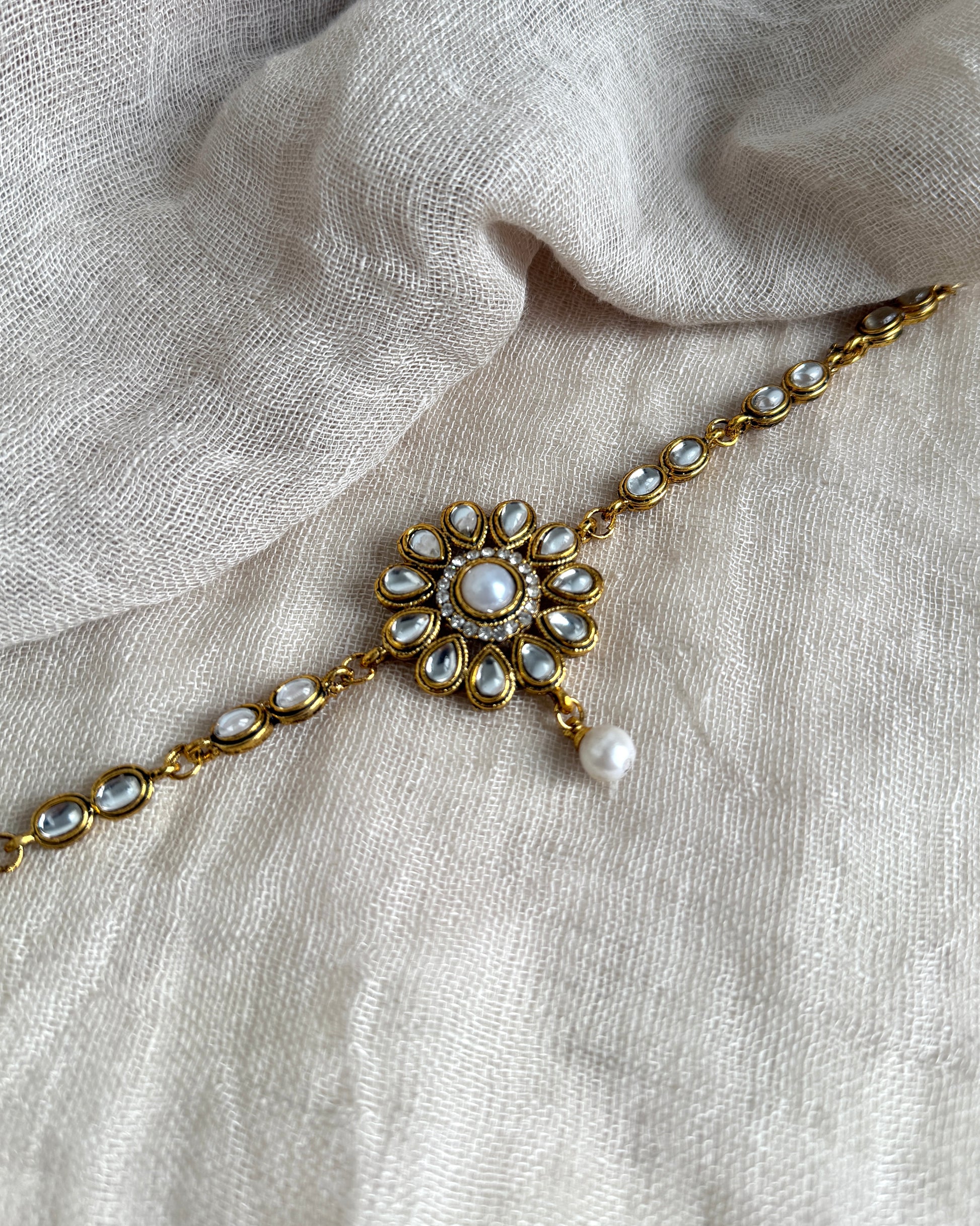 - afgewerkt met witte parels
